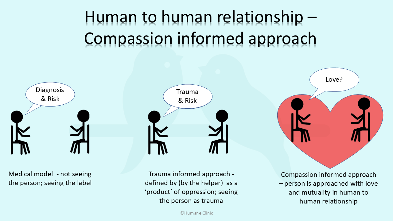 Compassion Informed Approach is the lens through which we hear another person’s story in human-to-human connection without deferring to models of mending that obscure the person, the context of their distress and our ability to offer mutuality. The approach acknowledges the co-opting of meaningful trauma-informed theory and approaches by illness and diagnostic paradigms.